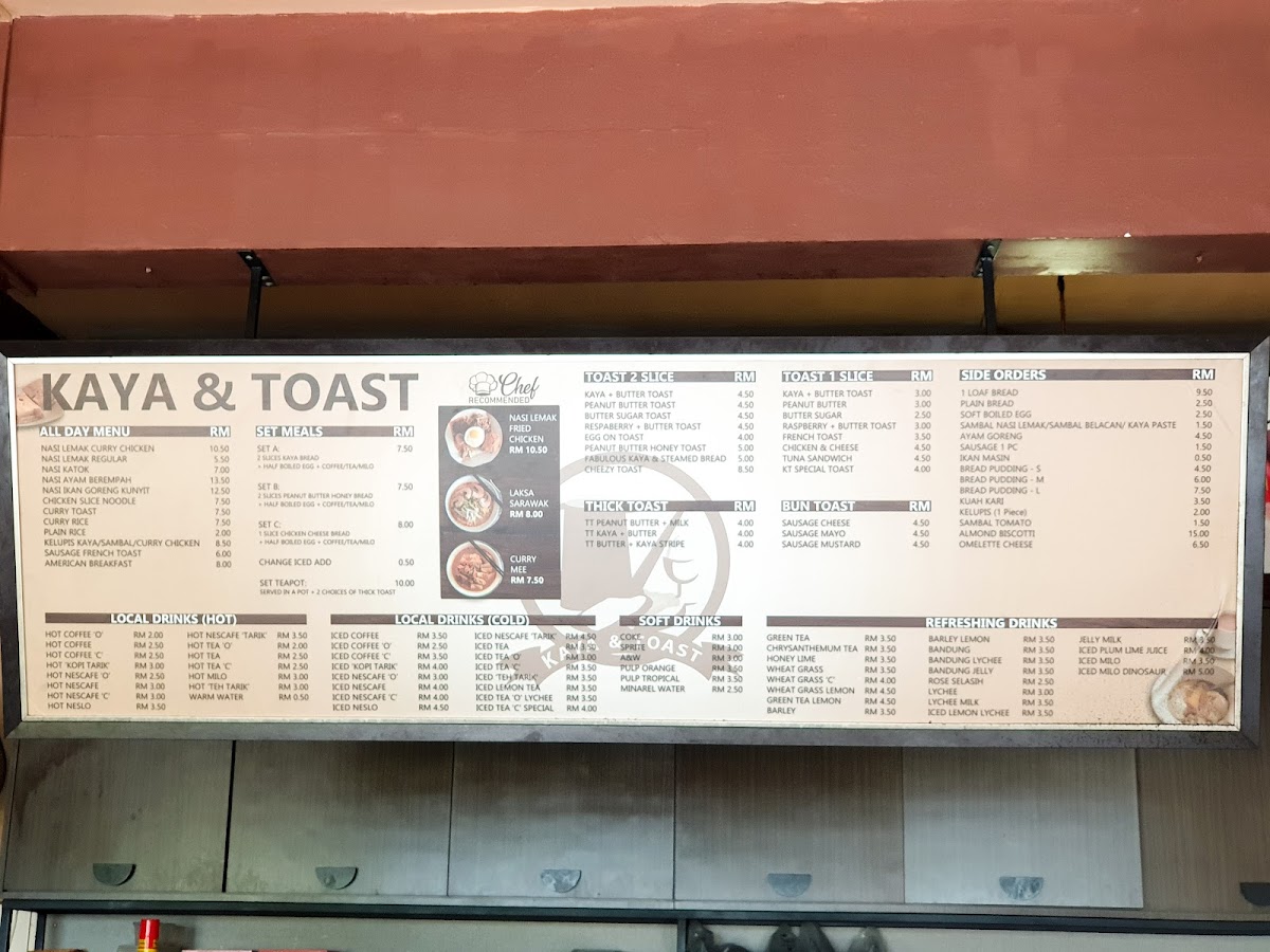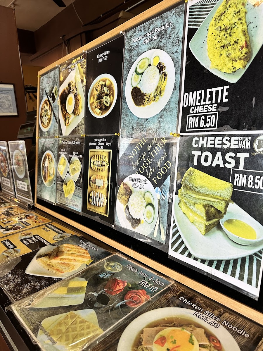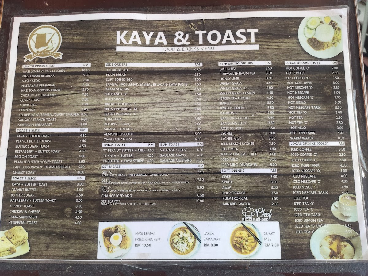 The menu at Kaya & Toast in Miri offers a delightful mix of Malaysian comfort food that satisfies a variety of tastes. For those seeking a hearty meal, the sets like Set B and Set C, featuring dishes like Kelupis Sambal and Kelupis Curry, provide filling options, each offering unique flavors at an affordable price. Noodle lovers can indulge in Curry Mee, Laksa Sarawak Extra (extra portion), or the Laksa Sarawak Mini (regular sized) for a deliciously spicy experience. The toast and sandwich options, such as the Cheezy + Chicken Slice Thick Toast and Omelette Cheese, Chicken Slice & Cheese Toast, offer a comforting start to the day. There’s also a selection of traditional Kaya toasts like the Thick Toast Kaya Stripe and the Thick Toast Peanut Butter Milk, perfect for those craving a lighter bite. The rice dishes are a highlight, with options like Nasi Lemak Regular, Nasi Ayam Goreng Berempah, and Nasi Ikan Goreng Kunyit, ideal for a flavorful, filling meal. For a more indulgent treat, the Nasi Lemak Fried Chicken and Curry Rice are also crowd favorites. The drink menu is equally diverse, with beverages like Hot Nescafe Tarik, Hot Tea, and Iced Kopi Tarik providing a perfect balance to the meal. Whether you're looking for something light or substantial, Kaya & Toast’s menu has a range of affordable options that cater to every craving.