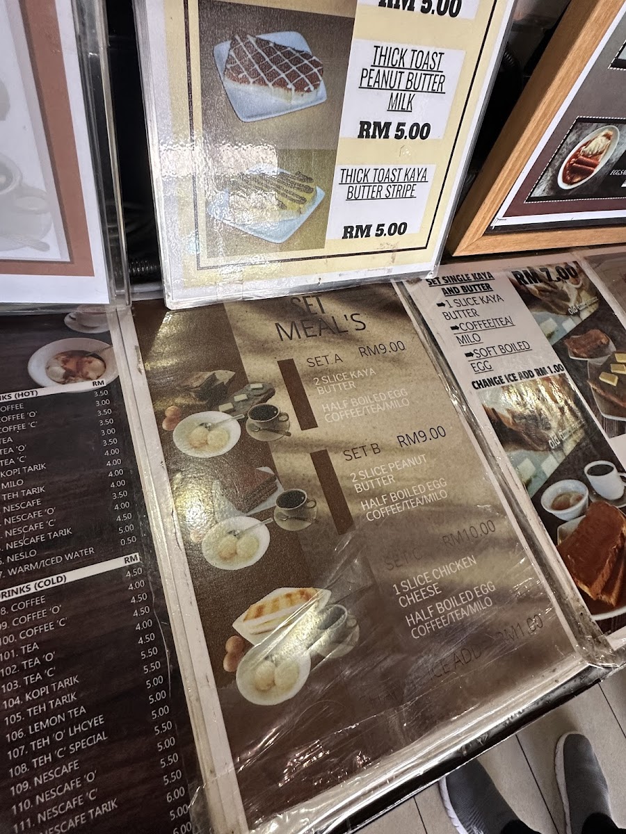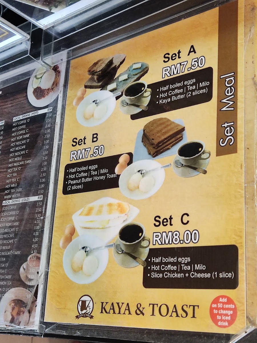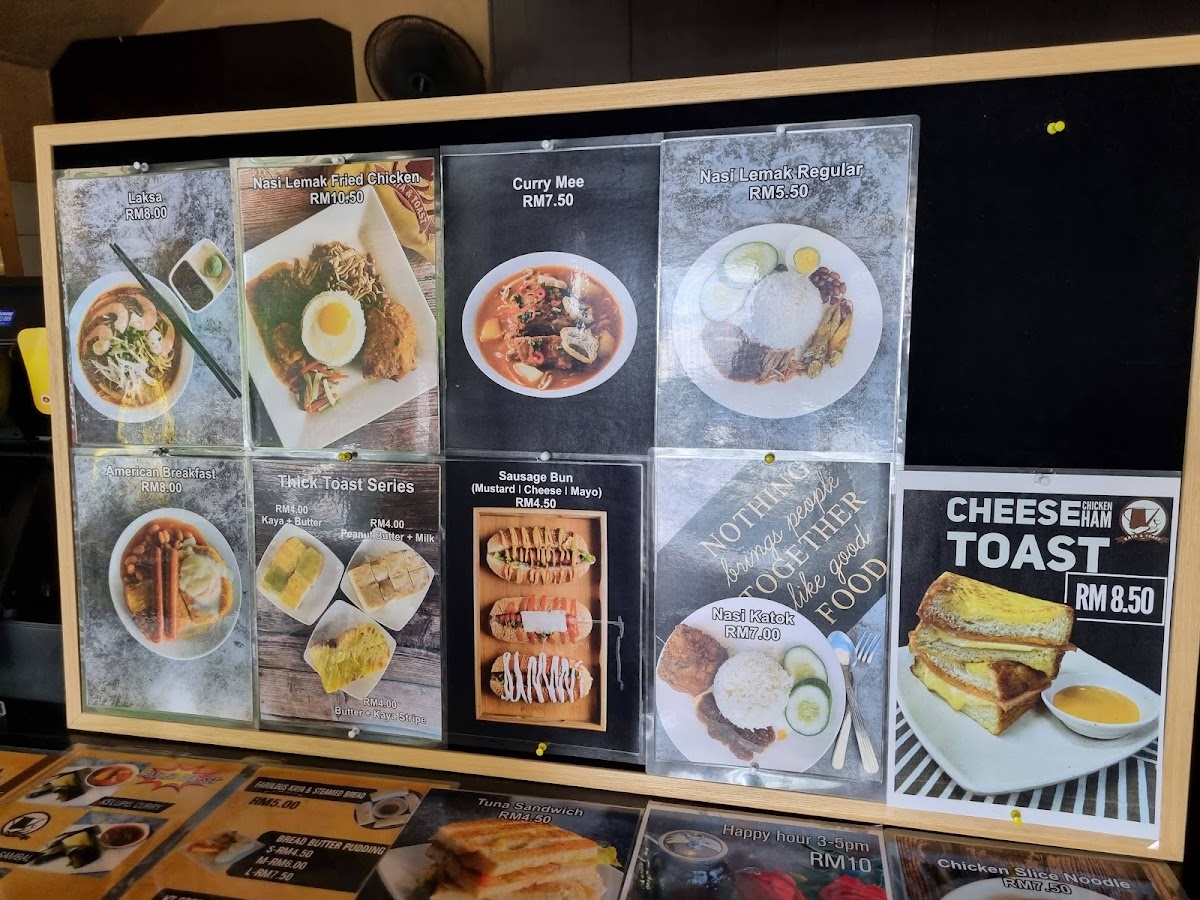 The menu at Kaya & Toast in Miri offers a delightful mix of Malaysian comfort food that satisfies a variety of tastes. For those seeking a hearty meal, the sets like Set B and Set C, featuring dishes like Kelupis Sambal and Kelupis Curry, provide filling options, each offering unique flavors at an affordable price. Noodle lovers can indulge in Curry Mee, Laksa Sarawak Extra (extra portion), or the Laksa Sarawak Mini (regular sized) for a deliciously spicy experience. The toast and sandwich options, such as the Cheezy + Chicken Slice Thick Toast and Omelette Cheese, Chicken Slice & Cheese Toast, offer a comforting start to the day. There’s also a selection of traditional Kaya toasts like the Thick Toast Kaya Stripe and the Thick Toast Peanut Butter Milk, perfect for those craving a lighter bite. The rice dishes are a highlight, with options like Nasi Lemak Regular, Nasi Ayam Goreng Berempah, and Nasi Ikan Goreng Kunyit, ideal for a flavorful, filling meal. For a more indulgent treat, the Nasi Lemak Fried Chicken and Curry Rice are also crowd favorites. The drink menu is equally diverse, with beverages like Hot Nescafe Tarik, Hot Tea, and Iced Kopi Tarik providing a perfect balance to the meal. Whether you're looking for something light or substantial, Kaya & Toast’s menu has a range of affordable options that cater to every craving.